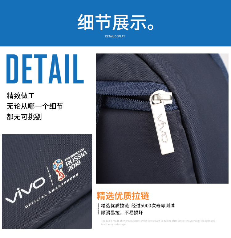 VIVO礼品包定制精选高品质面料,手感细腻,清晰纹路。可收缩肩带,可变手提包,包包背部设有防盗拉链袋。精选优质拉链,经过5000次寿命测试,顺滑易拉,不易顺坏。结实手挽,手感舒适不嘞手,包包手挽处打枣加固,增加包包牢固性。广东恩典科技创办于1997年,致力于背包、双肩包设计生产销售的箱包生产厂家,自有厂房1.5万平米,引进日本JUKI和BROTHER等高端品牌机器设备。我们提供颜色,材料都可以选择,如果没有您喜欢的款式,可以免费设计。大部分是样品,非现货,少量现货,请咨询客服,接受来样来图定制!定制热线:18575391373