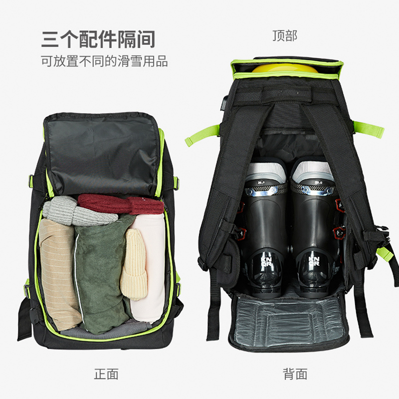 多功能户外滑雪包定制50L大容量,采用600D防腐水材质,里面材质PVC防水编织布。三个配件隔间,可以放置不同的滑雪用品。滑雪板可以固定在滑雪包上,单板双板都可以背上。滑雪包定制请认准广东恩典科技,25年箱包行业生产定制经验,自建1.5万平米工业园,8000平米工作区,462名艺师,16条生产线,日产量可达13000Pcs。自有实验室拥有恒温恒湿、拉力、盐雾、破裂、拉链往复等检测设备,从原材料到成品每一个环节都经严格的检测,恩典皮具所使用的材料均达到国际环保REACH标准,客户中标率和返单率高达70%,5年畅销达到500万个。从开发到生产,专人为您把关每一个环节做好跟进服务。定制热线:18575391373