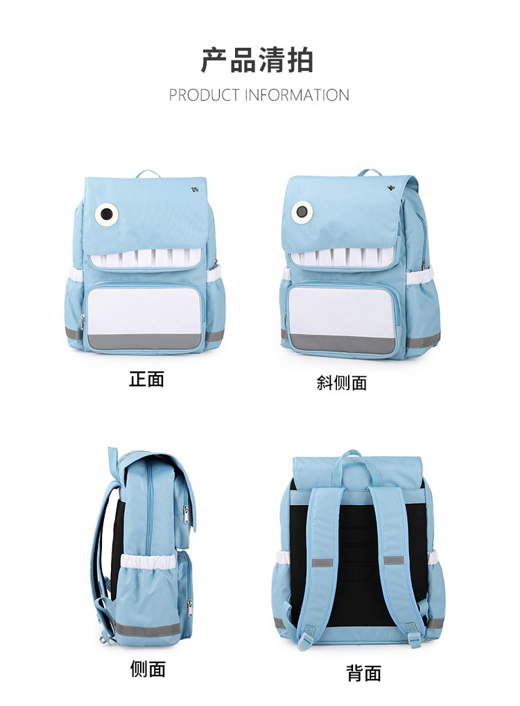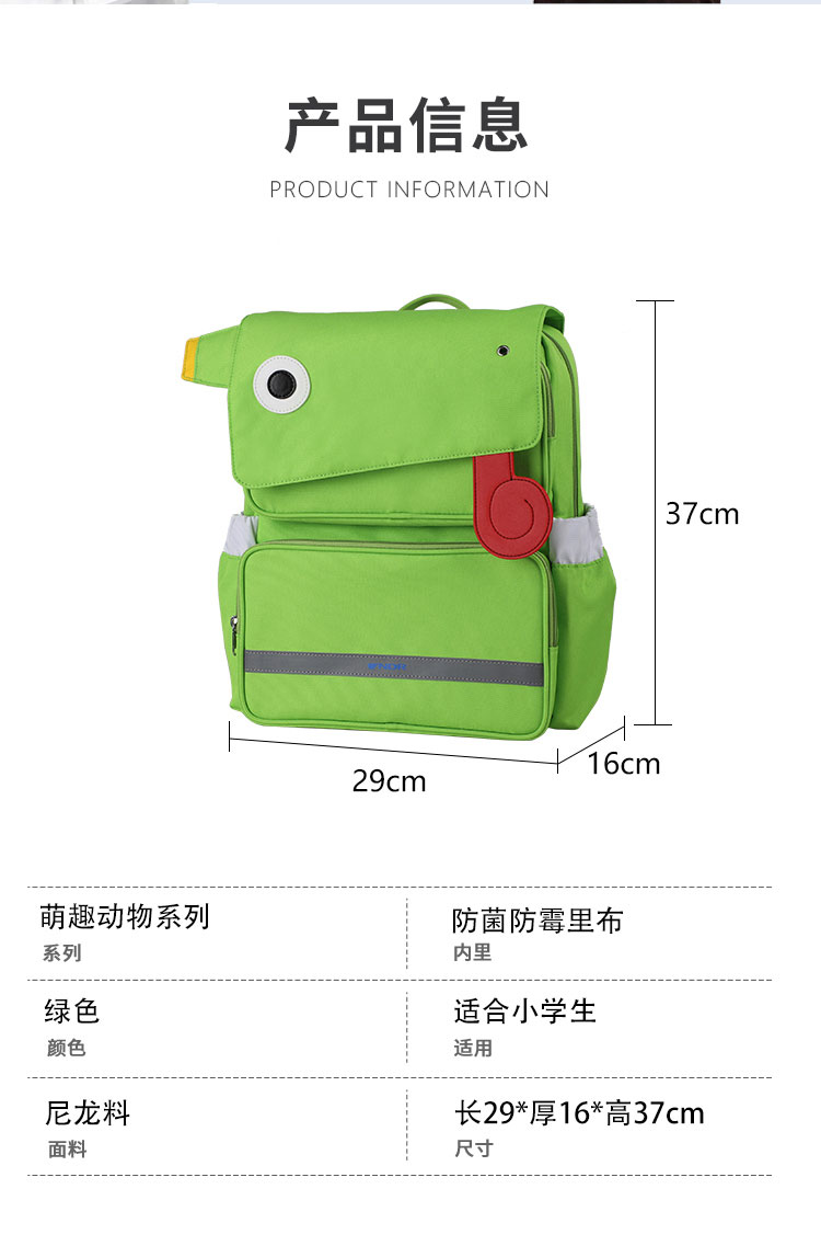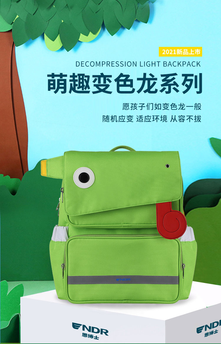 学生书包定制萌趣变色龙系列关注孩子脊椎健康,使用护脊书包,预防高低肩和驼背。两个大容量前幅袋,方便孩子存取随身物品。学生书包定制请认准广东恩典科技,25年箱包行业生产定制经验,自建1.5万平米工业园,8000平米工作区,462名艺师,16条生产线,日产量可达13000Pcs。自有实验室拥有恒温恒湿、拉力、盐雾、破裂、拉链往复等检测设备,从原材料到成品每一个环节都经严格的检测,恩典皮具所使用的材料均达到国际环保REACH标准,客户中标率和返单率高达70%,5年畅销达到500万个。从开发到生产,专人为您把关每一个环节做好跟进服务。定制热线:18575391373