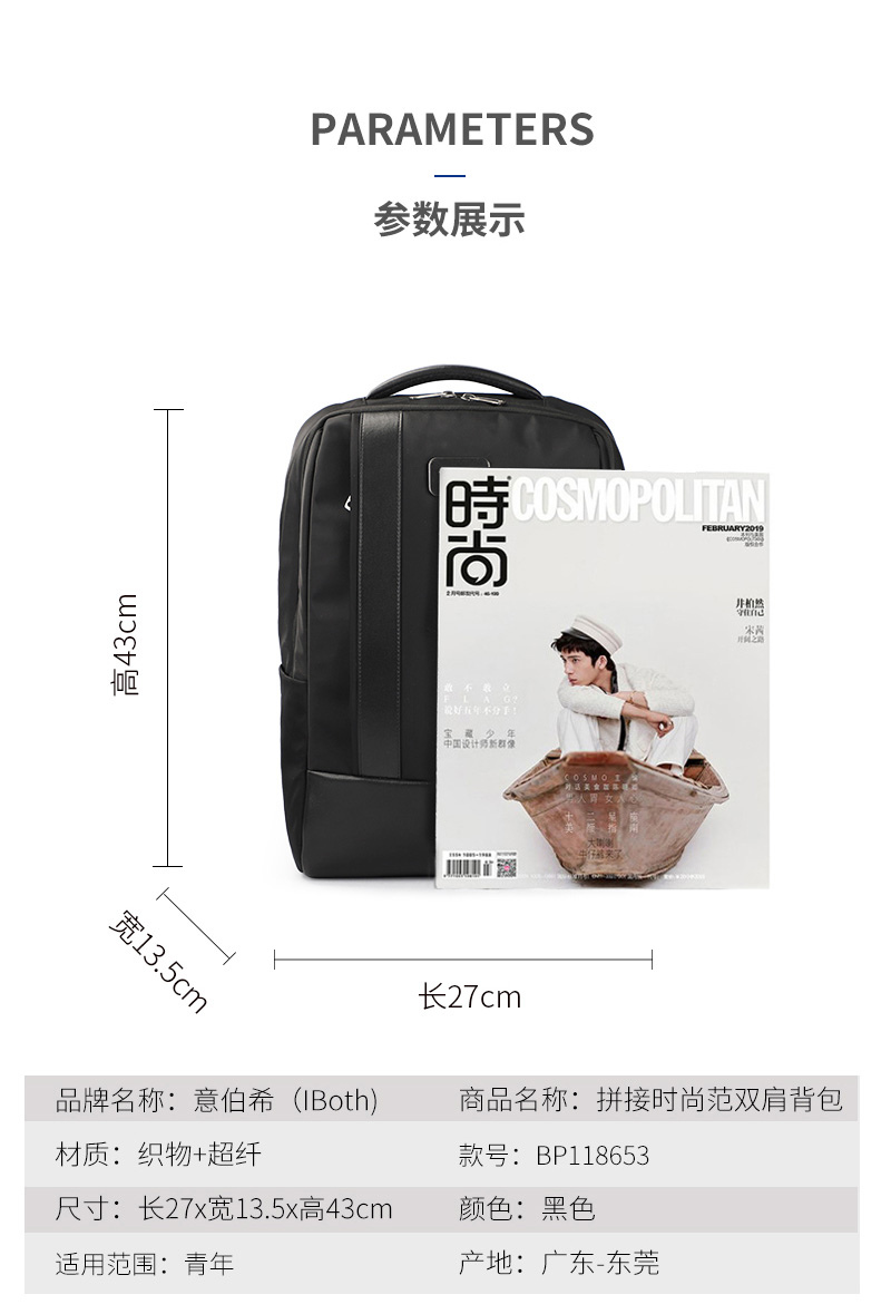 拼接时尚范双肩背包定制精选高端雪松底复合290T斜纹料,手感舒适,纹路清晰色泽持久,不易褪色,防泼水。配料选用高档超纤材质,耐磨,抗污染能力强。易于保养,无气味。双肩包不同的用途分成,双肩电脑背包(Computer Backpack),运动双肩包(Sports Backpack),时尚双肩包(Fashion Backpack),学校双肩包背(School Backpack)和束口绳包,军用背包(Military Backpack),登山包等等。根据材质的不同又会成帆布包,牛津布包,尼龙布包。恩典科技专注背包oem/odm箱包定制23年,致力于为知名品牌客户提供礼品包定制服务,是一家集设计、研发、生产、销售于一体的箱包生产厂家,拥有大型物理测试实验室,出口欧美品质经得起考验,欢迎来样定制,定制热线:185-7539-1373