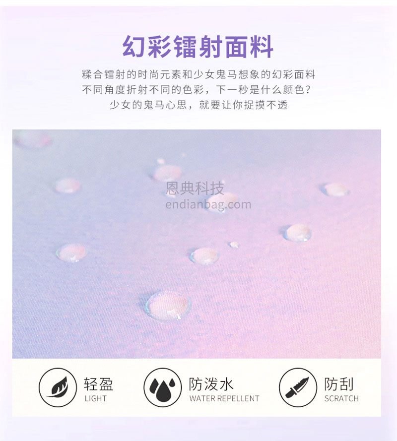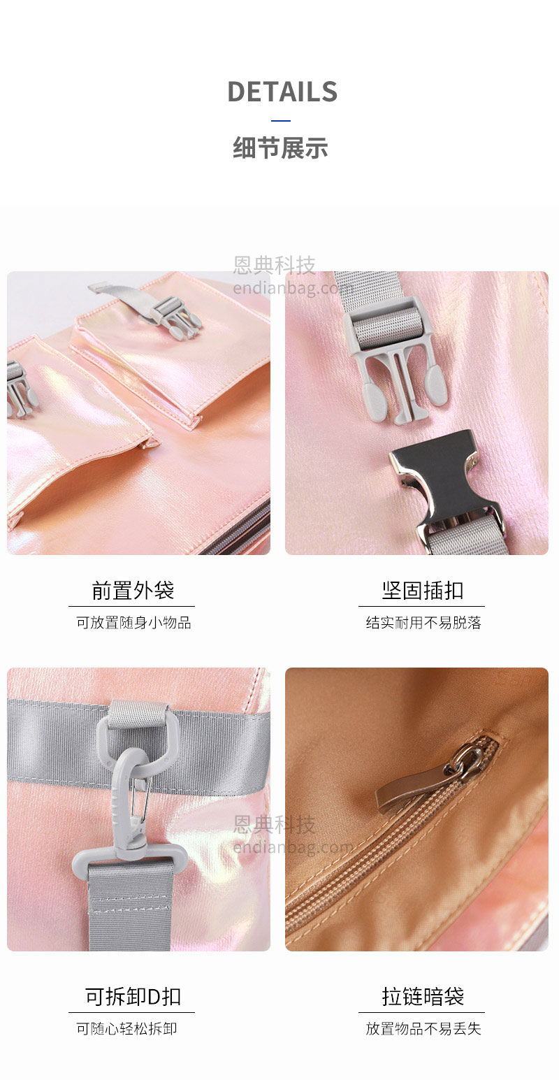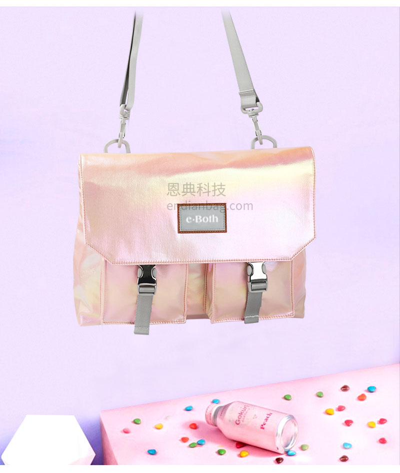 女士时尚休闲斜挎包定制功能存储,科学分区,大容量主袋+拉链暗袋+插袋,分门别类,取放自如。前置外袋可放置随时小物品,坚固插扣,结实耐用不易脱落。包包定制请找广东恩典科技,恩典科技是一家以设计研发、生产销售、品牌打造为一体的智能箱包生产厂家,产品时尚,外光精致,交货准时。定制热线:18575391373