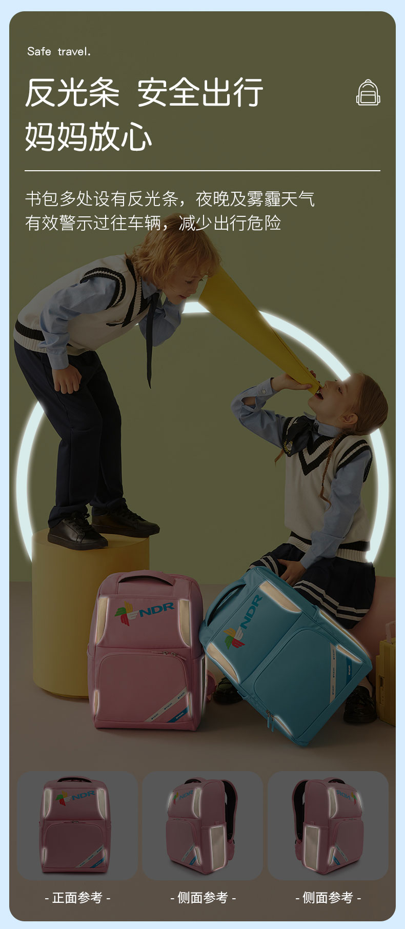 二、反光条设计,包包的正面和侧面都有反光条,当孩子夜间出行时,在车灯的照射下进行反光,有效警示车辆,减少出行安全