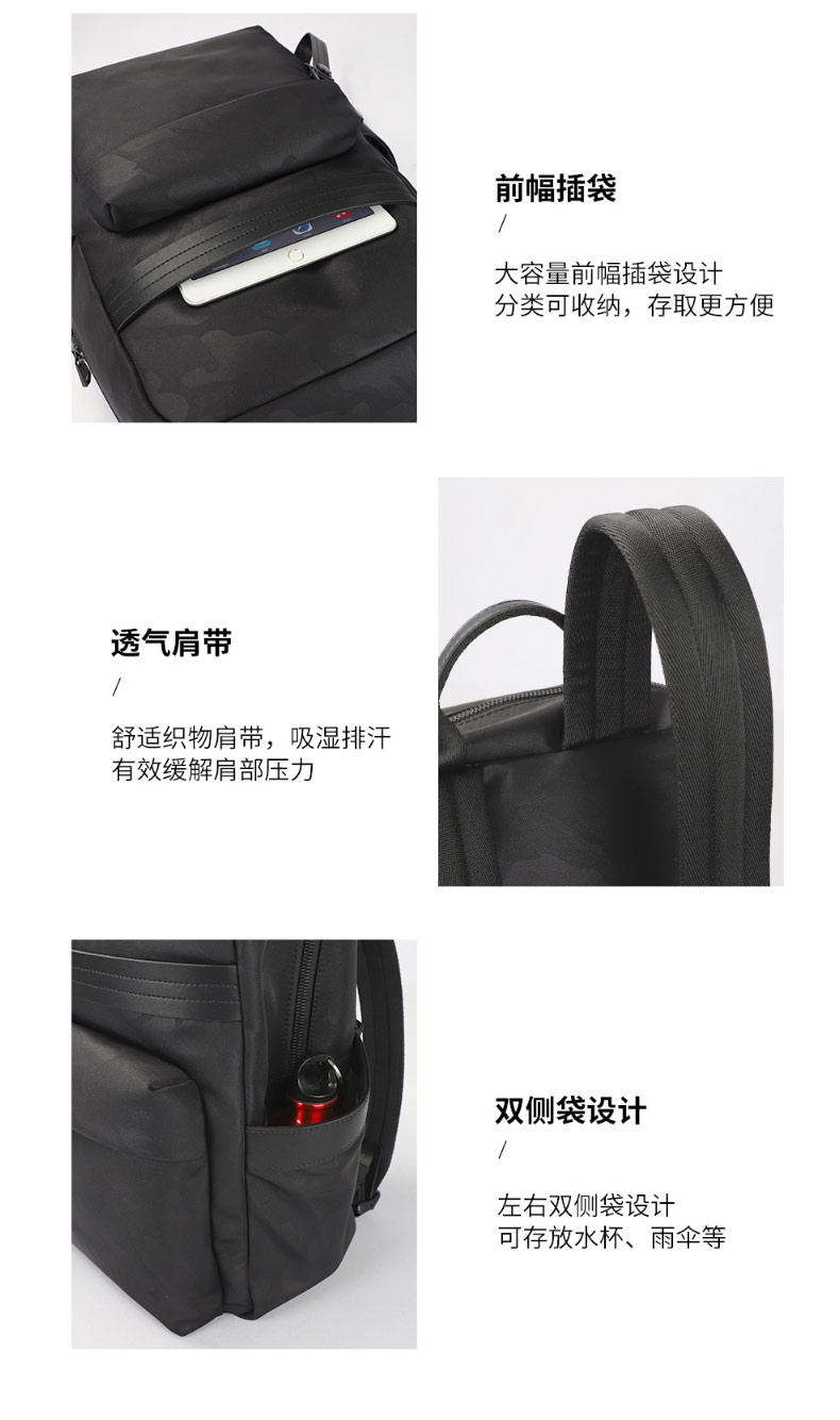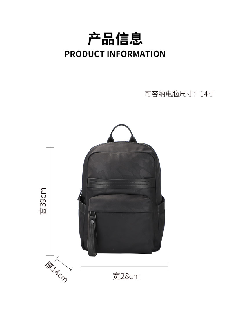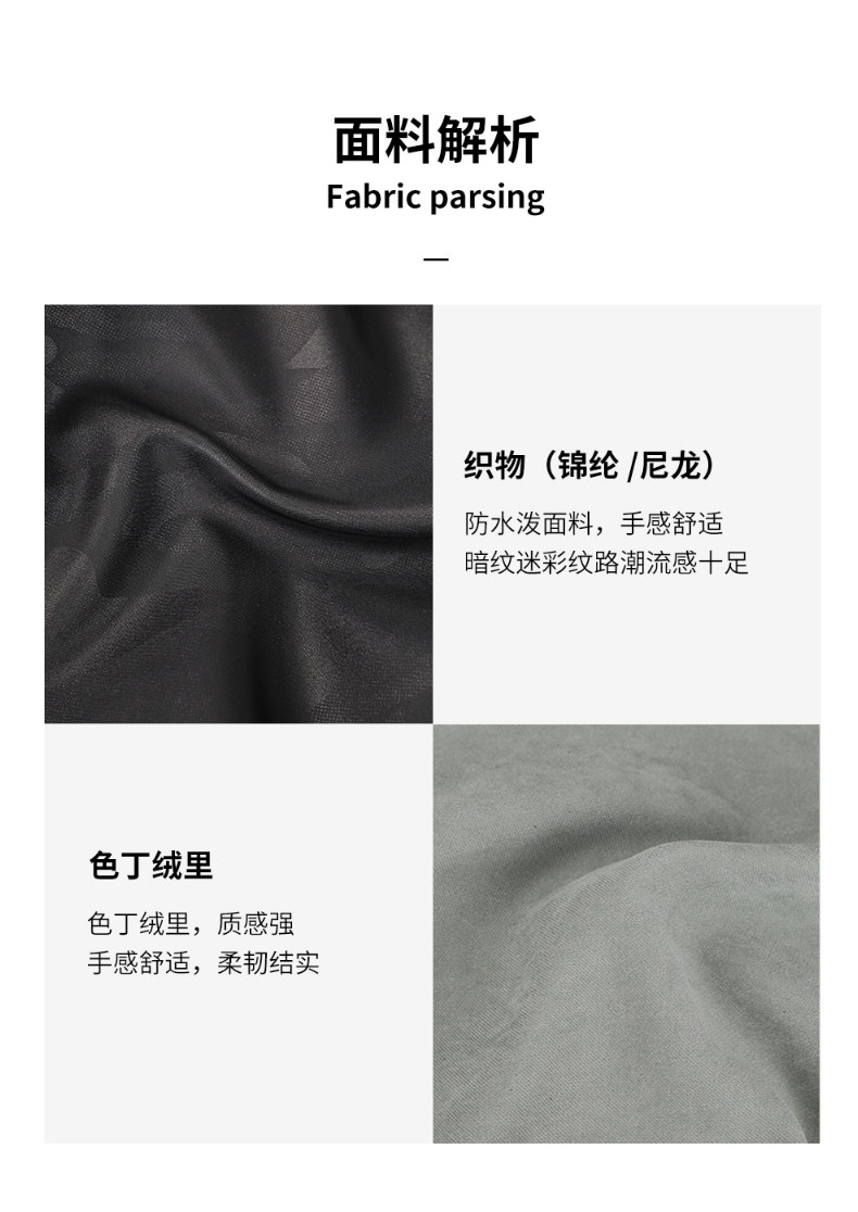 防水泼面料,手感舒适,暗纹迷彩纹路潮流感十足;